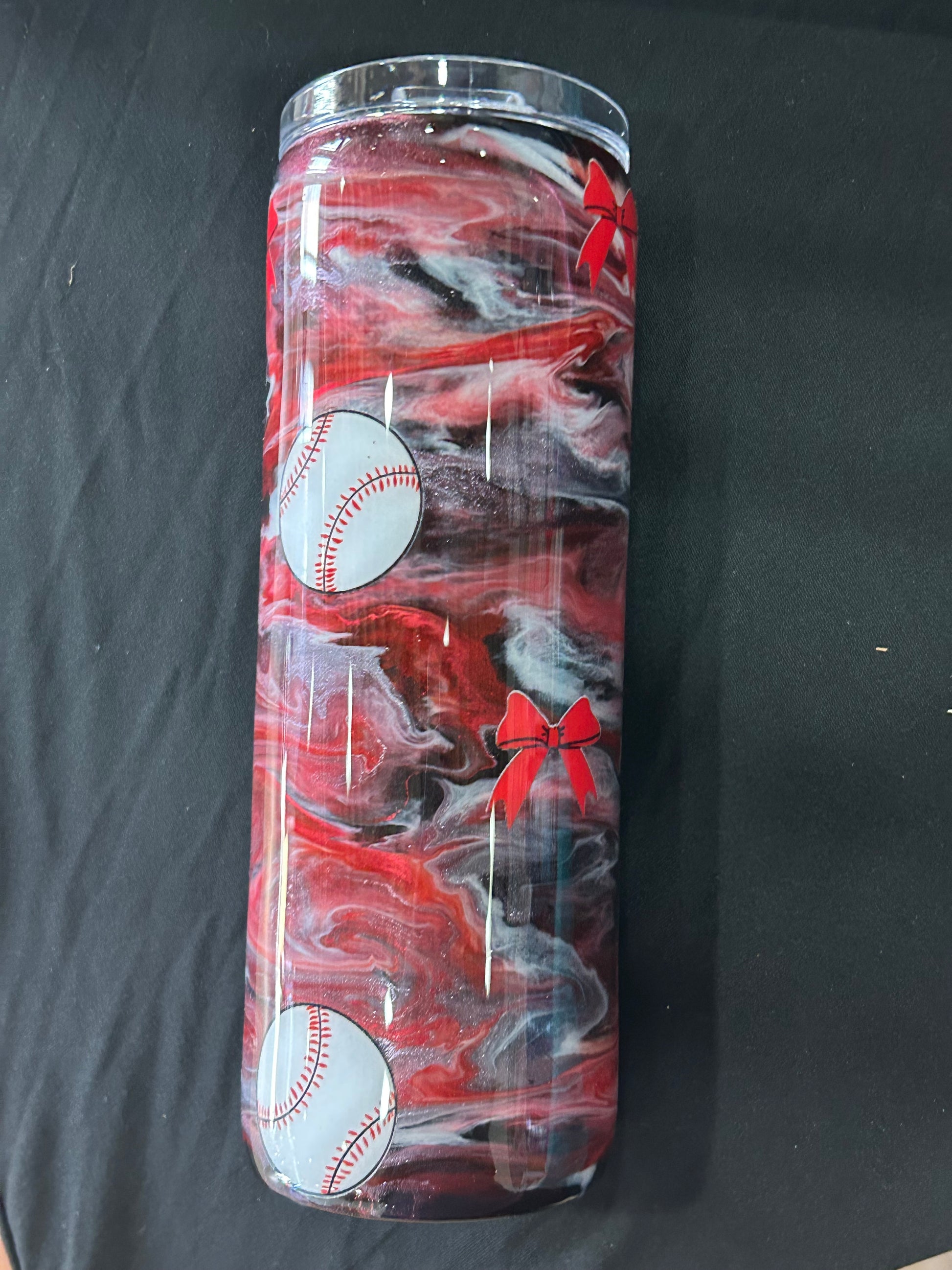 Red and white alcohol inks swirled on a black spray painted tumbler. Baseballs and red bow decals were used